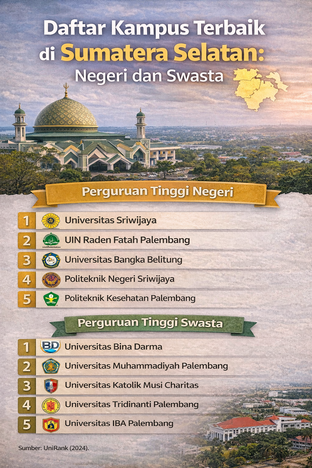 Berlokasi di Palembang dan Ogan Ilir, Universitas Sriwijaya (Unsri) merupakan perguruan tinggi negeri terbesar dan paling bergengsi di Sumatera Selatan. Kampus ini memiliki berbagai fakultas unggulan seperti Kedokteran, Teknik, Hukum, Ekonomi, dan Pertanian.